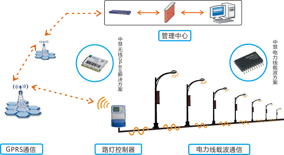 中慧电力线载波通信产品具功耗低、通信稳定、可靠性高等特点,并能通过通信中继方式极大地拓展通信距离,可应用于路灯控制方案的路灯控制终端,为本地路灯控制提供稳定的下行电力线载波通信技术方案。